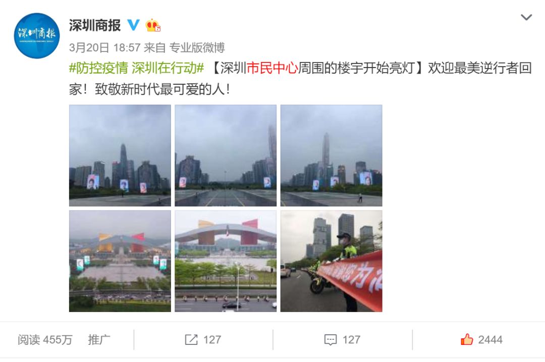 單條微博【深圳市民中心周圍的樓宇開始亮燈】閱讀數(shù)455萬+,引起了廣泛關注。
