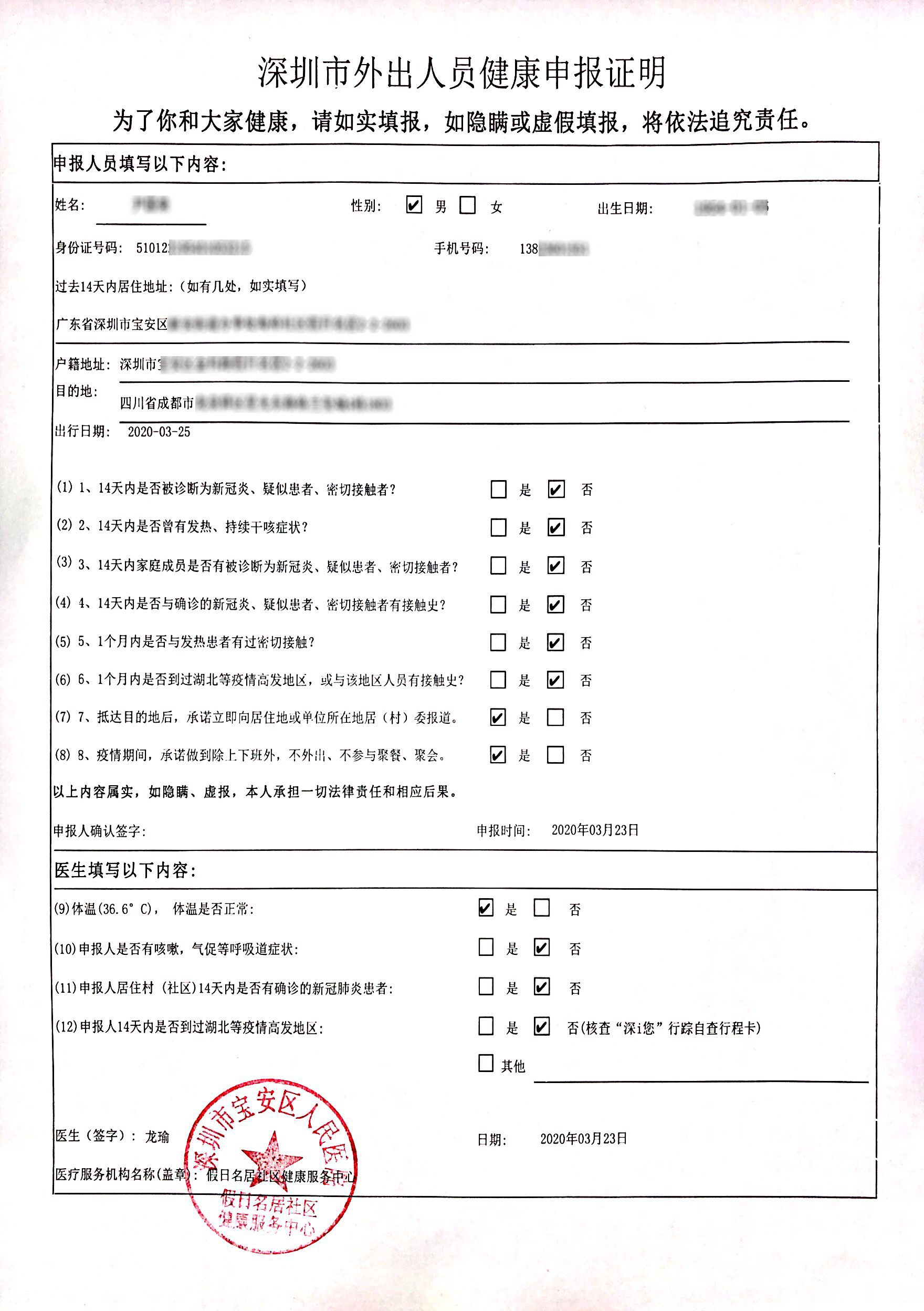 為了保障疫情期間深圳市外出人員的有序正常出行,根據(jù)廣東省要求,疫情期間因出差、經(jīng)商、務工等原因需到外省(市、區(qū) )的居民,如果出行目的地要求提供健康證明,可免費申請辦理《深圳市外出人員健康申報證明》。