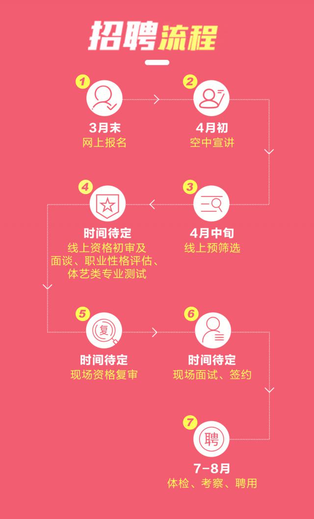 據(jù)悉,此次招聘將于3月末啟動網(wǎng)上報名,4月初進(jìn)行"空中"宣講,4月中旬進(jìn)行線上預(yù)篩選,此后還將有線上資格初審及面談、職業(yè)性格評估、體藝類專業(yè)測試、現(xiàn)場資格復(fù)審等環(huán)節(jié),錄用者將于7至8月進(jìn)行體檢、考察聘用。