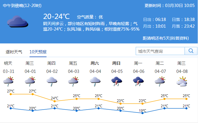 市氣象臺預(yù)測,31日至4月1日有陣雨或雷陣雨;2-3日多云到陰天,部分時間有分散小雨;展望清明假期期間,有明顯降雨過程。注意雨霧天氣低能見度對交通安全的影響。