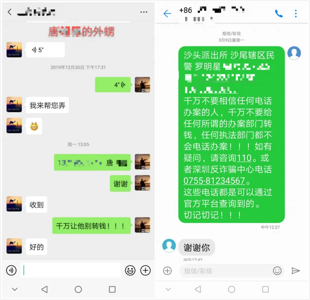3月9日上午,唐先生也接到了一通詐騙來電。民警在接到預(yù)警后,立即趕到唐先生住所,發(fā)現(xiàn)唐先生并不在住所,而且手機(jī)處于關(guān)機(jī)狀態(tài)。爭分奪秒時刻,民警通過其老鄉(xiāng)找到了唐先生的外甥,成功聯(lián)系上了在外地的唐先生。原來,唐先生接到了詐騙電話,對方詢問唐先生是否需要貸款,表示他們可以用非常簡單的手續(xù)幫忙貸到款,前提是需要先交保證金。就在唐先生猶豫不決的時候,接到了民警和外甥的電話,避免了可能造成的損失。