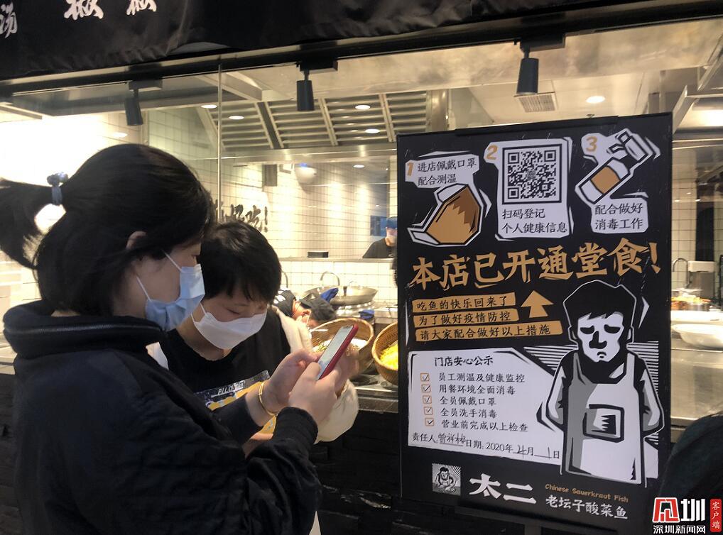 在太二酸菜魚門口,多位市民正按照員工要求,排隊(duì)掃碼登記個(gè)人健康信息。太二酸菜魚工作人員表示,門店嚴(yán)格按照要求,做好員工和消費(fèi)者體溫檢測(cè)、健康監(jiān)控和佩戴口罩洗手消毒等防疫防控工作。