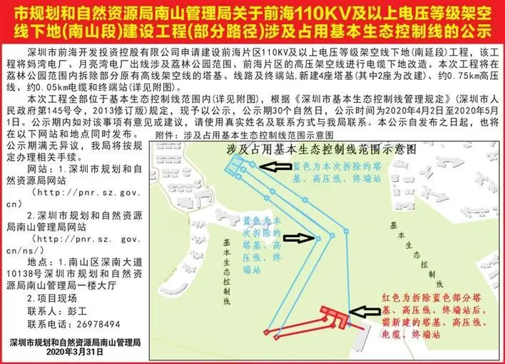 該工程將對媽灣電廠、月亮灣電廠出線,涉及荔林公園范圍、前海片區(qū)的高壓架空線,進行電纜下地改造,荔林公園內(nèi)部分原有的高壓架空線的塔基、線路及終端站將會被拆除,將新建、改建各2座塔基。