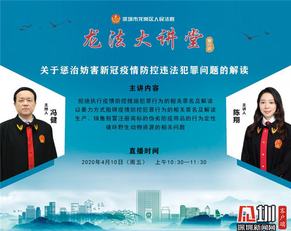 見圳客戶端·深圳新聞網(wǎng)4月10日訊(見圳客戶端、深圳新聞網(wǎng)記者 李云云 通訊員 張建國)4月10日上午,龍崗法院“龍法大講堂”上線第六講,再次以直播方式,就妨害疫情防控違法犯罪問題向觀眾進行詳細解讀。