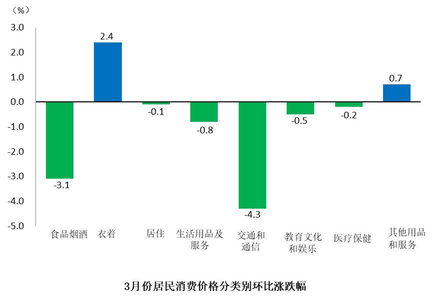 總體來看,食品價格環(huán)比下降4.3%,非食品價格環(huán)比下降0.7%;服務價格環(huán)比下降0.9%,消費品價格環(huán)比下降1.9%。
