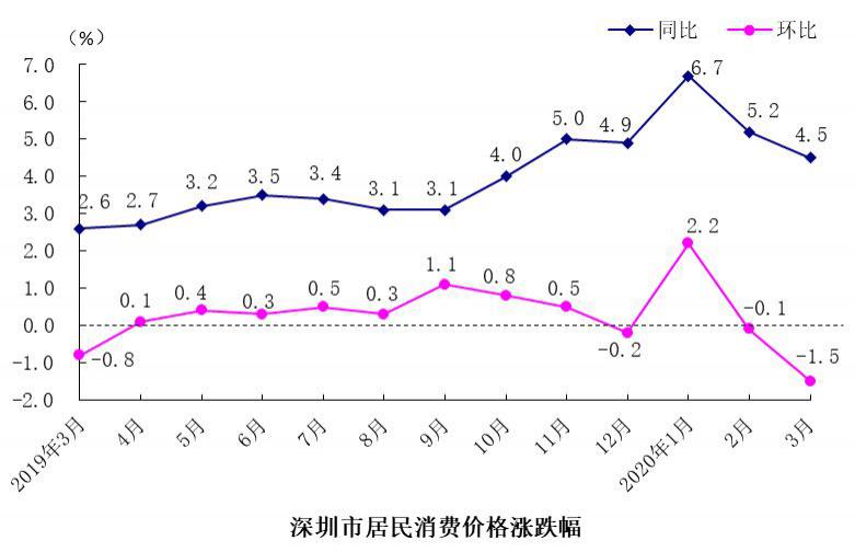 深圳特區(qū)報2020年4月12日訊 4月12日,國家統(tǒng)計局深圳調查隊發(fā)布最新統(tǒng)計數據,3月份,深圳居民消費價格(CPI)環(huán)比下降1.5 %,降幅比上月擴大1.4個百分點;CPI同比上漲4.5%,漲幅比上月收窄0.7個百分點。