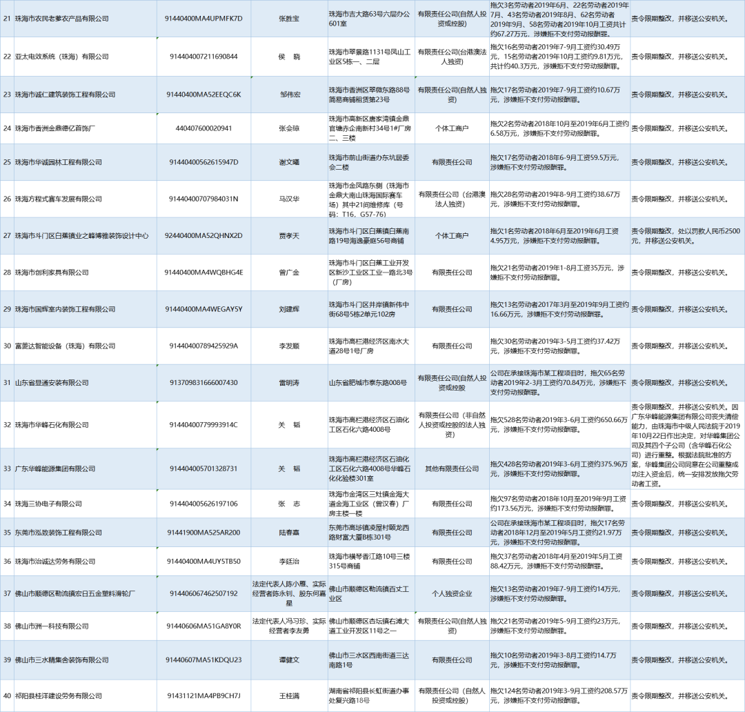 為加強(qiáng)對(duì)違法用人單位的社會(huì)監(jiān)督,強(qiáng)化誠(chéng)信體系建設(shè),加大威懾力,依據(jù)《廣東省用人單位重大勞動(dòng)保障違法行為社會(huì)公布暫行規(guī)定》,省人社廳公布2020年第一批重大違法案件,涉及81家企業(yè),其中深圳豬兼強(qiáng)互聯(lián)網(wǎng)科技有限公司拖欠138名勞動(dòng)者2019年5-6月工資約100.01萬(wàn)元,涉嫌拒不支付勞動(dòng)報(bào)酬罪,被責(zé)令限期整改,并移送公安機(jī)關(guān)。深港東成睡袋(深圳)有限公司拖欠327名勞動(dòng)者2019年6-7月工資約295.8萬(wàn)元,涉嫌拒不支付勞動(dòng)報(bào)酬罪,被責(zé)令限期整改,處以罰款人民幣4萬(wàn)元,并移送公安機(jī)關(guān)。
