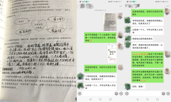 疫情來的迅猛又猝不及防,老師們一方面要完成教學(xué)任務(wù)、引導(dǎo)學(xué)生做好防疫,一方面要時刻關(guān)注學(xué)生的心理健康。學(xué)生們被迫在家度過了一個史上最長的寒假,對于處在叛逆期的孩子們來說,難免會與家人出現(xiàn)一些矛盾,在課堂之外,老師們還需要擔(dān)任“心理調(diào)節(jié)師”的角色。一次,周老師班上有個同學(xué)因為上網(wǎng)課的事情與父母鬧了矛盾,一氣之下跑到奶奶家,周老師得知了這件事情,第一時間聯(lián)系上學(xué)生,通過鼓勵、引導(dǎo),讓學(xué)生認(rèn)識到自己的錯誤,與父母和解。還有一次,周老師通過批改作業(yè),發(fā)現(xiàn)一名學(xué)生在作業(yè)中吐露了自己孤獨(dú)、無趣的心聲。看到后,周老師立刻與家長溝通了解情況,并建議家長多多陪伴孩子。盡管老師和學(xué)生們不能在學(xué)校的課堂上相聚,但在通訊十分發(fā)達(dá)的現(xiàn)在,老師們也始終用自己的方式陪伴在學(xué)生左右。