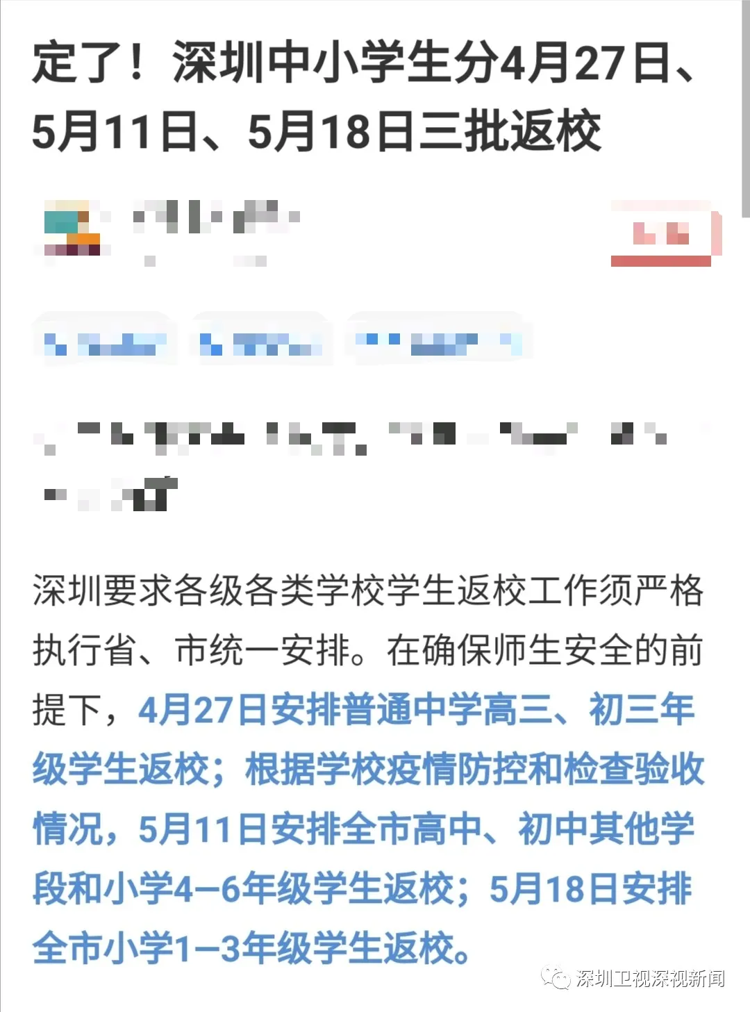 近日,有媒體報道稱,深圳中小學(xué)生返校時間已確定。5月11日安排全市高中、初中其他學(xué)段和小學(xué)4—6年級學(xué)生返校;5月18日安排全市小學(xué)1—3年級學(xué)生返校。