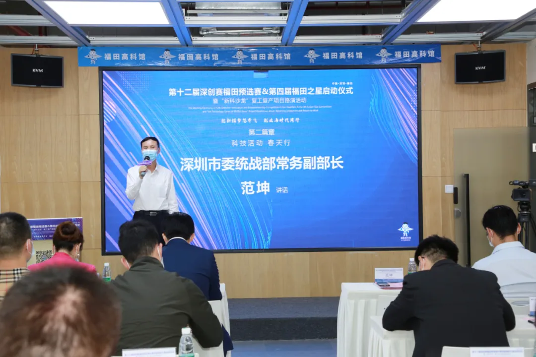 4月23日,由深圳市新聯(lián)會(huì)科技聯(lián)盟、福田高科館主辦的第十二屆深創(chuàng)賽福田預(yù)選賽&第四屆福田之星啟動(dòng)儀式暨“新科沙龍”復(fù)工復(fù)產(chǎn)項(xiàng)目路演活動(dòng)在福田高科館舉行,并進(jìn)行全程網(wǎng)絡(luò)同步直播。深圳市委統(tǒng)戰(zhàn)部常務(wù)副部長范坤出席活動(dòng)。
