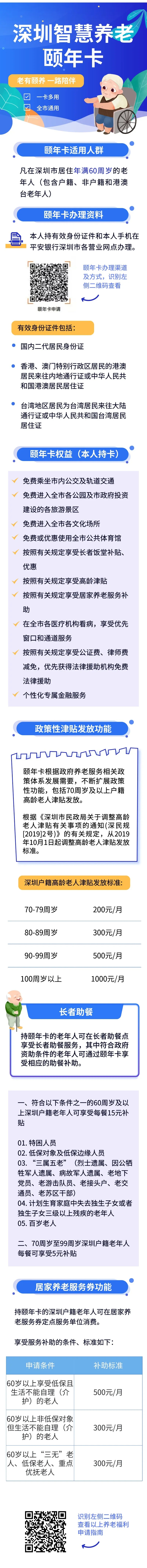 據(jù)悉,凡在深圳市居住年滿60周歲以上的老年人(包含港澳臺老年人),均可持有效身份證件和手機申請辦理。“頤年卡”持卡人,可享受敬老優(yōu)待,包括免費進入全市各公園,免費進入市政府投資建設各旅游景區(qū),免費乘坐市內公交車和軌道交通。70周歲及以上戶籍老人還可享受高齡津貼發(fā)放;符合規(guī)定的戶籍老年人可享受居家養(yǎng)老消費的優(yōu)惠和補貼,包括:生活照料、家政服務、康復護理服務、日托服務、心理咨詢等。