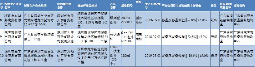 通告顯示,深圳抽檢的3批不合格樣品分別為深圳市寶盈天和百貨有限公司銷售的增厚型紙杯、為盛百貨有限公司觀瀾分店銷售的熱飲紙杯和萬福達百貨有限公司銷售的180ml一次性紙杯(50個),不合格項目均為容量及容量偏差不符合食品相關(guān)產(chǎn)品安全國家標準規(guī)定。