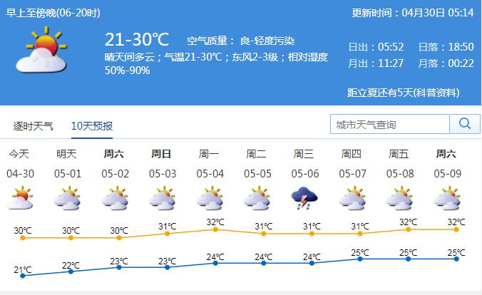 見(jiàn)圳客戶端·深圳新聞網(wǎng)2020年4月30日訊 我市今天晴天間多云,氣溫21-30℃;東風(fēng)2-3級(jí),相對(duì)濕度50%-90%。五一假期期間(5月1-5日)天氣總體平穩(wěn),以多云為主,早晚有輕霧,其中5日前后偶有短時(shí)陣雨;假期期間最高氣溫可達(dá)31-32℃,中午前后天氣炎熱。森林火險(xiǎn)氣象等級(jí)較高,要注意用火安全;注意防暑防嗮。