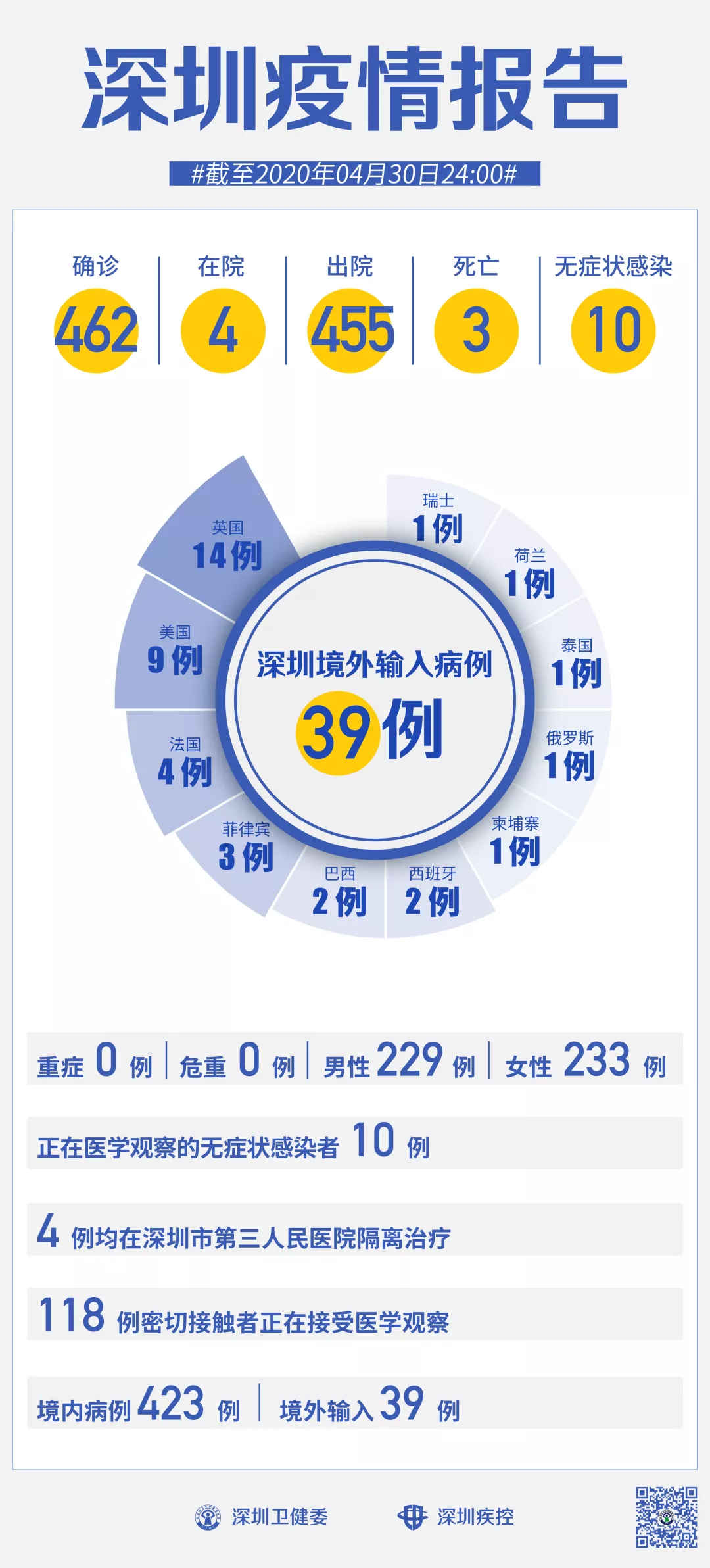 截至4月30日24時,深圳累計報告新冠肺炎病例462例。4月30日當天新增無癥狀感染者2例,出院1例。