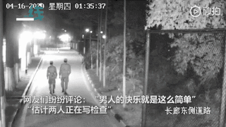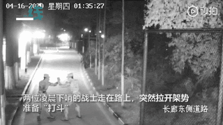 兩位凌晨下哨的戰(zhàn)士走在路上,突然間拉開架勢,準備“打斗”。劍拔弩張之際,突然畫風(fēng)一轉(zhuǎn),兩人做起了互相加油打氣的動作。