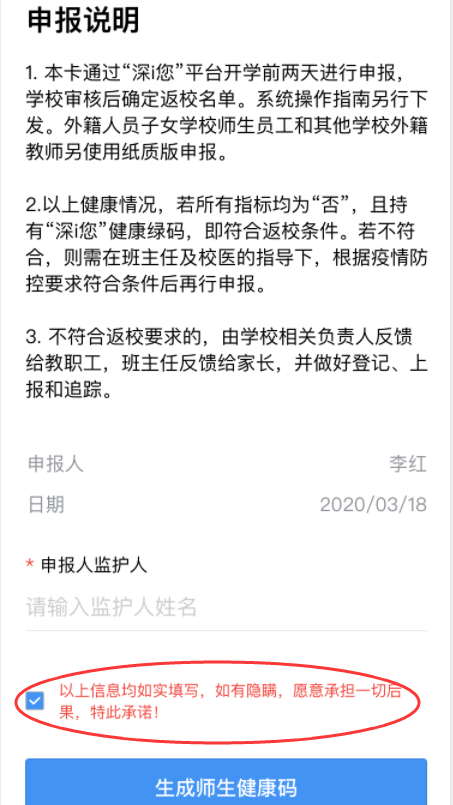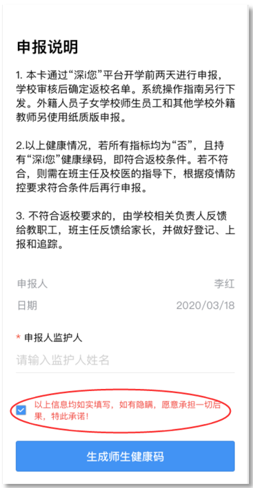 ⑤完成健康信息申報,包括選擇家庭住址、申報健康情況、填寫監(jiān)護人姓名等,請勾選申報承諾,點擊“生成師生健康碼”即可完成健康申報。