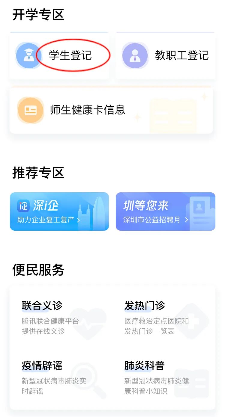 ①在首頁開學(xué)專區(qū),點擊“學(xué)生登記”進入申報人員列表,進行自主申報和實名認(rèn)證,再進行開學(xué)登記。