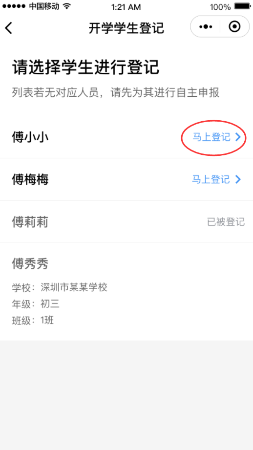 ③完成后進入“開學(xué)學(xué)生登記”頁面,選擇學(xué)生名字旁邊的“馬上登記”,填寫班主任姓名和手機號碼后點擊“下一步”。
