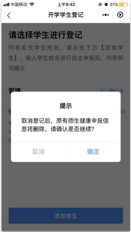 ②點(diǎn)擊“取消登記”,平臺(tái)彈出提示“取消登記后,原有師生健康申報(bào)信息將刪除,請(qǐng)確認(rèn)是否繼續(xù)?”,點(diǎn)擊“確定”,即取消成功。取消成功后,可重新進(jìn)行開學(xué)登記。
