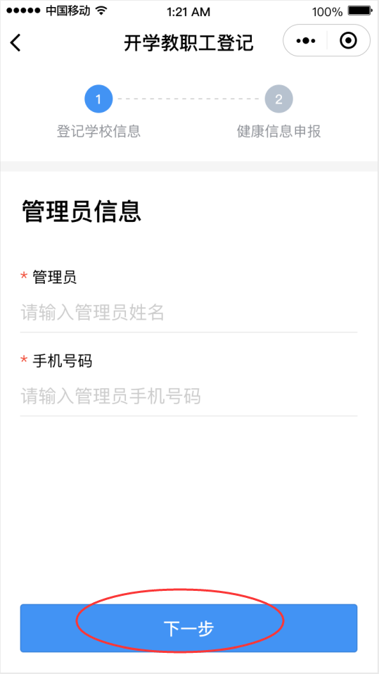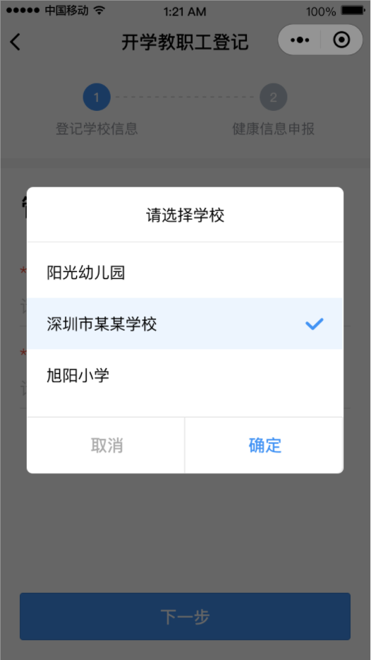 ②點(diǎn)擊“馬上登記”按鈕,填寫學(xué)校管理員姓名和手機(jī)號(hào)碼(學(xué)校管理員姓名和手機(jī)號(hào)碼請(qǐng)?jiān)儐枌W(xué)校獲得)后點(diǎn)擊“下一步”,然后選擇對(duì)應(yīng)的學(xué)校。
