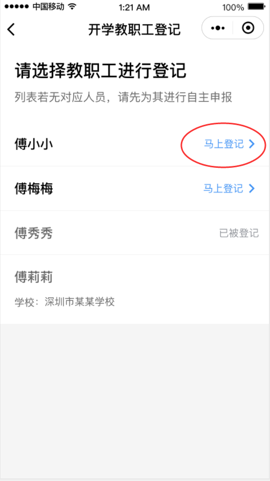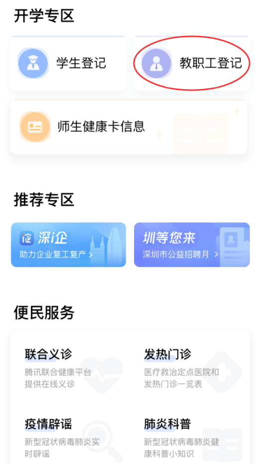 ①在首頁開學(xué)專區(qū),點(diǎn)擊“教職工登記”進(jìn)入申報(bào)人員列表,進(jìn)行自主申報(bào)和實(shí)名認(rèn)證。