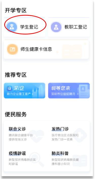 ①在首頁開學(xué)專區(qū),點(diǎn)擊“學(xué)生登記”進(jìn)入申報(bào)人員列表,進(jìn)行自主申報(bào)和實(shí)名認(rèn)證,再進(jìn)行開學(xué)登記。
