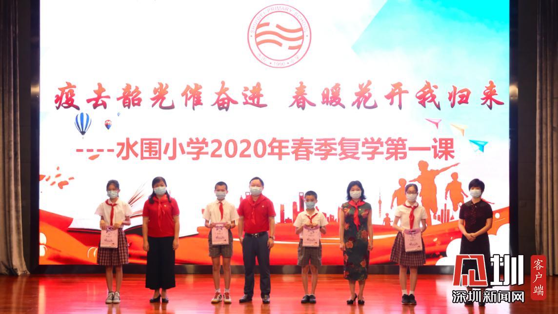 據(jù)悉,水圍小學(xué)“復(fù)學(xué)典禮”上午8:40正式開始,出席的嘉賓有福田區(qū)教科院教研員、少先隊總輔導(dǎo)員李楠、衛(wèi)生健康副校長明昭。各班級的學(xué)生則帶著口罩,單人單桌在教室內(nèi),以觀看直播的方式參加典禮。