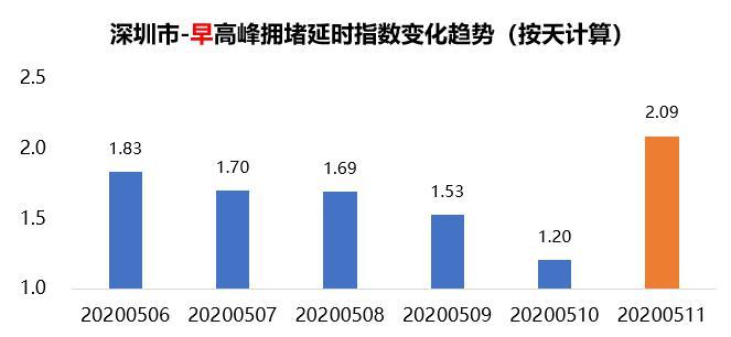 此外,隨著廣州和深圳部分年級開學(xué)復(fù)課,疊加通勤出行需求,統(tǒng)計數(shù)據(jù)顯示,5月11日廣深兩市均迎來最堵早高峰,其中8:00-9:00時段擁堵程度最高,早高峰擁堵延時指數(shù)分別為1.9和2.09。而晚高峰方面,從5月6日至5月11日數(shù)據(jù)來看,廣州和深圳在5月8日的擁堵程度最高,晚高峰擁堵延時指數(shù)分別為2.10和2.00。