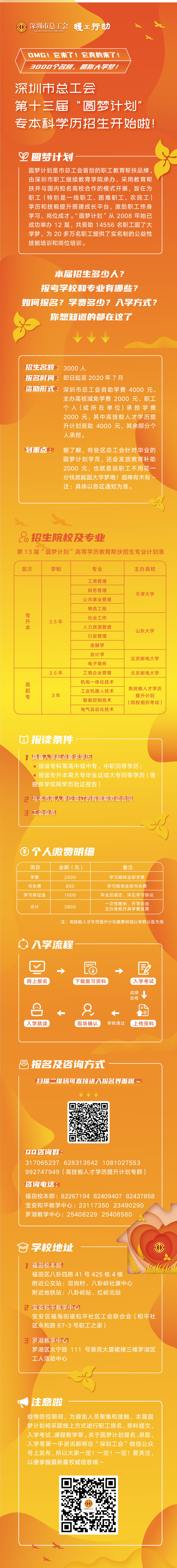 在疫情防控、復(fù)工復(fù)產(chǎn)的特殊形勢(shì)下,結(jié)合市總工會(huì)“暖工行動(dòng)”相關(guān)要求,本屆“圓夢(mèng)計(jì)劃”進(jìn)一步提高幫扶精準(zhǔn)性,向受疫情影響嚴(yán)重的企業(yè)和職工傾斜,推動(dòng)企業(yè)和職工共擔(dān)責(zé)任、共克時(shí)艱,穩(wěn)定職工隊(duì)伍和就業(yè),努力做到職工多轉(zhuǎn)崗、少下崗、多就業(yè)、少失業(yè)。符合報(bào)名條件的職工可在“深圳工會(huì)”微信公眾號(hào)上進(jìn)行報(bào)名,報(bào)名截止日期為7月30日,主辦方將根據(jù)報(bào)名人數(shù)分期分批組織入學(xué)考試。入學(xué)考試采用“文化素養(yǎng)+職業(yè)技能+工作實(shí)績(jī)”的多元評(píng)價(jià)方式,在“文化素養(yǎng)”為主體考試中增加工會(huì)基本知識(shí),提高職工工會(huì)意識(shí)。所有錄取學(xué)員將于今年9月入學(xué)就讀,進(jìn)行線(xiàn)上線(xiàn)下相結(jié)合的學(xué)習(xí),在規(guī)定學(xué)制內(nèi)修滿(mǎn)學(xué)分將獲得各高校頒發(fā)、國(guó)家承認(rèn)的畢業(yè)證書(shū)。