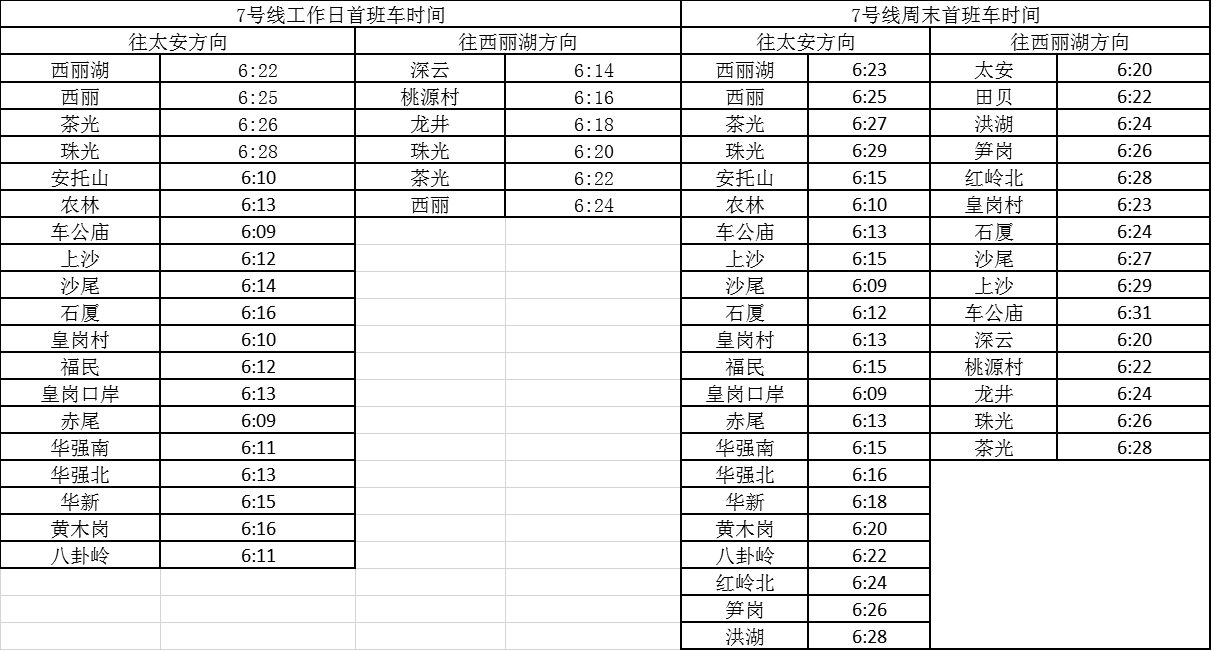 記者獲悉,經(jīng)優(yōu)化調(diào)整后,各線路工作日首班車(chē)最早發(fā)車(chē)站點(diǎn)及時(shí)間分別為,1號(hào)線老街站6:29、2號(hào)線蛇口港站6:14、3號(hào)線塘坑站6:05、5號(hào)線坂田站6:01、7號(hào)線赤尾6:09、9號(hào)線銀湖6:05、11號(hào)線機(jī)場(chǎng)站6:04。周末期間首班車(chē)最早發(fā)車(chē)站點(diǎn)及時(shí)間分別為,2號(hào)線香梅北站6:07、3號(hào)線塘坑站6:04、5號(hào)線長(zhǎng)嶺陂站6:00、7號(hào)線皇崗口岸站6:09、9號(hào)線孖嶺站6:05、11號(hào)線機(jī)場(chǎng)站6:03。