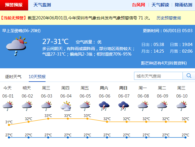 深圳市氣象臺預報,未來一周我市天氣仍不穩(wěn)定,雷雨多發(fā)。6月1日至5日,多云有陣雨或雷陣雨,局地雨勢較大,天氣漸趨悶熱。目前我市處于龍舟水降水多發(fā)季節(jié),需特別關注降雨給交通帶來的影響。請市民及時關注市氣象臺發(fā)布的最新氣象監(jiān)測預報和預警信息。