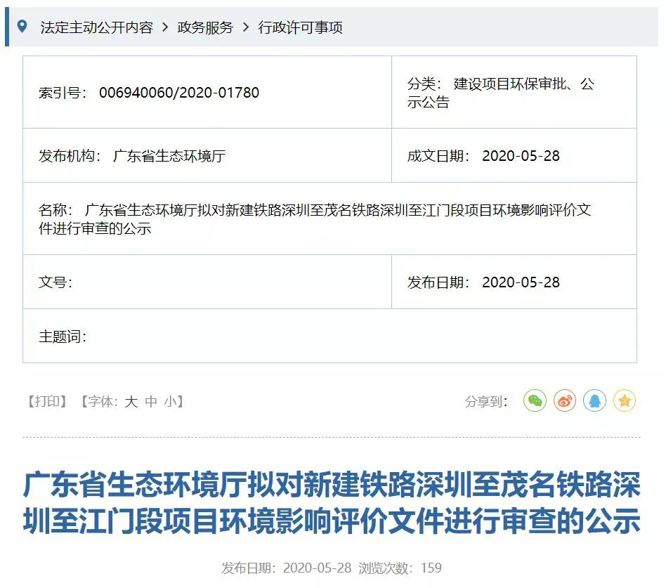 5月28日,廣東省生態(tài)環(huán)境廳發(fā)布擬對新建鐵路深圳至茂名鐵路深圳至江門段項(xiàng)目環(huán)境影響評價文件進(jìn)行審查的公示,這意味著項(xiàng)目前期工作接近尾聲,距離開工又進(jìn)了一步。