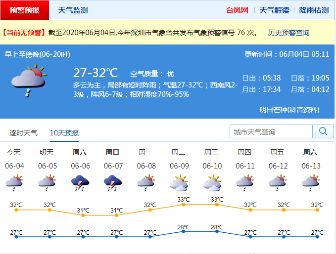 見圳客戶端·深圳新聞網(wǎng)2020年06月04日訊 深圳今日天氣多云為主,局部有短時陣雨;氣溫27-32℃;西南風(fēng)2-3級,陣風(fēng)6-7級;相對濕度70%-95%