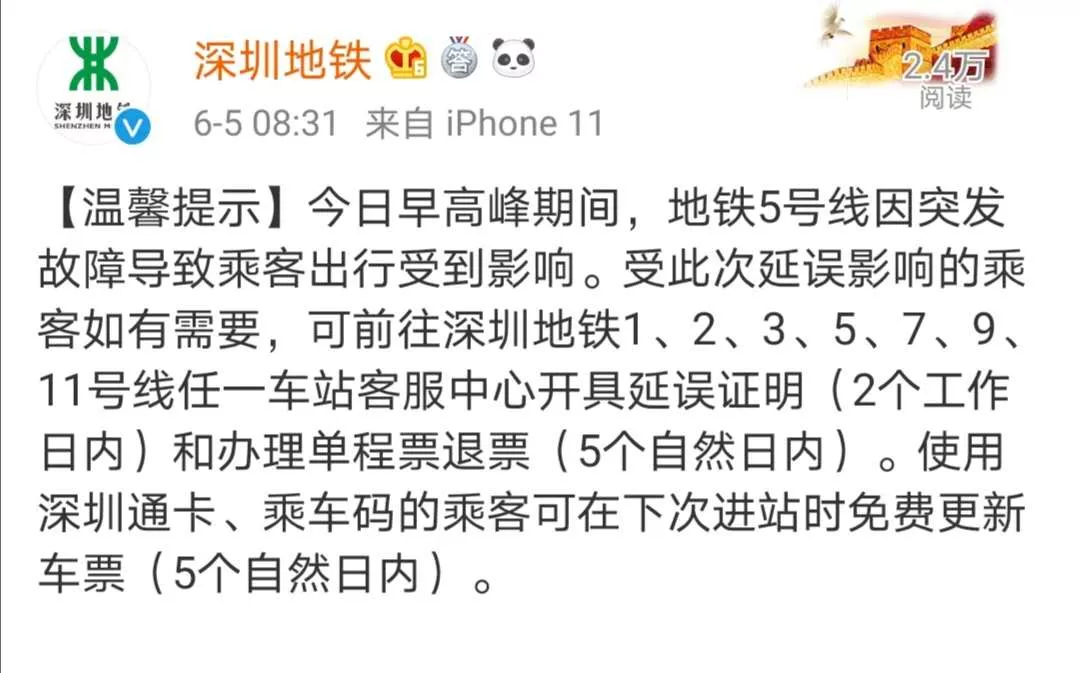 隨后,深圳地鐵官方微博發(fā)布溫馨提示,今日(6月5日)早高峰期間,地鐵5號線因突發(fā)故障導(dǎo)致乘客出行受到影響。受此次延誤影響的乘客如有需要,可前往深圳地鐵1、2、3、5、7、9、11號線任一車站客服中心開具延誤證明(2個工作日內(nèi))和辦理單程票退票(5個自然日內(nèi))。使用深圳通卡、乘車碼的乘客可在下次進(jìn)站時(shí)免費(fèi)更新車票(5個自然日內(nèi))。