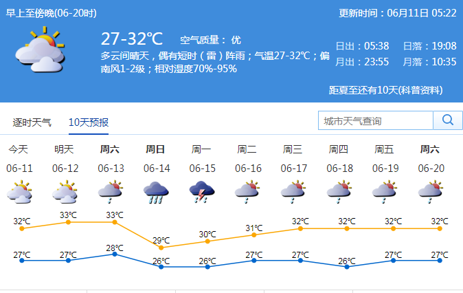 市氣象臺預測,11-13日多云到晴天,偶有局地短時(雷)陣雨,天氣悶熱,11日氣溫27-32℃;展望14-15日有一次降雨過程。