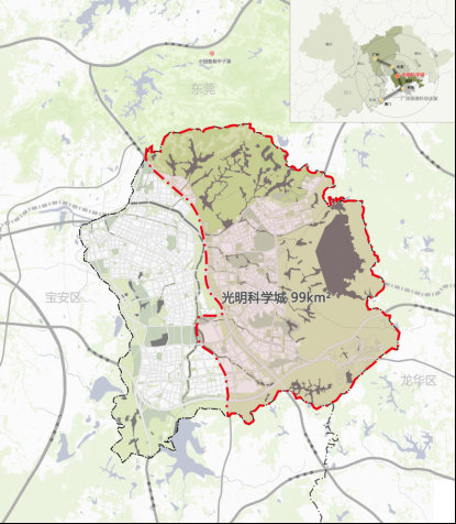 光明科學(xué)城北起深莞邊界,東部和南部以光明區(qū)轄區(qū)為界,西部以龍大高速和東長(zhǎng)路為界,規(guī)劃總面積99 平方公里。