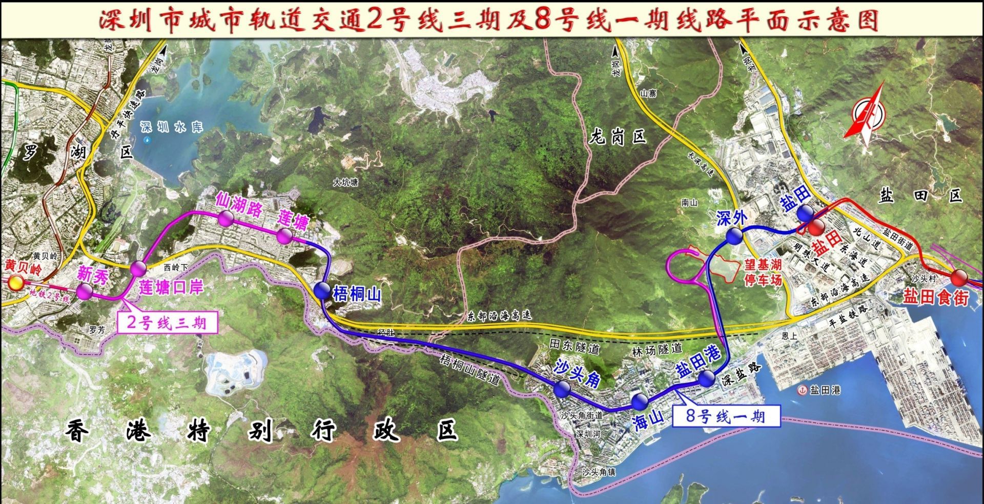 8號線一期工程由2號線三期工程蓮塘站站后折返線接出,起于梧桐山南站,終點(diǎn)為鹽田路站,后接包含大梅沙站、小梅沙站的8號線二期工程(在建),線路全長12.34km,包含6站及6區(qū)間。