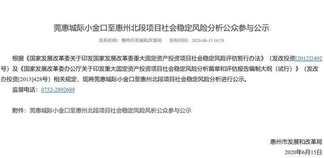 6月15日下午,惠州市發(fā)改局發(fā)布《莞惠城際小金口至惠州北段項目社會穩(wěn)定風(fēng)險分析公眾參與公示》,征求公眾對項目建設(shè)的意見和建議。
