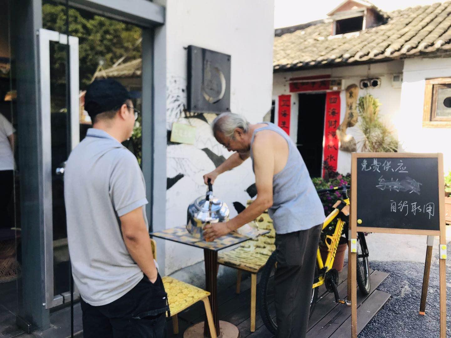 一張桌子、兩把椅子、一壺水就是一個(gè)涼茶點(diǎn),一旁支起的黑板上還寫(xiě)著“免費(fèi)供應(yīng)、自行取用”八個(gè)字。這里的涼茶從下午三點(diǎn)半開(kāi)始準(zhǔn)時(shí)向過(guò)往行人免費(fèi)提供,一直到晚上七八點(diǎn)。愛(ài)心涼茶供應(yīng)點(diǎn)的發(fā)起人叫陳小林,熟悉他的人都稱(chēng)呼他小林哥。