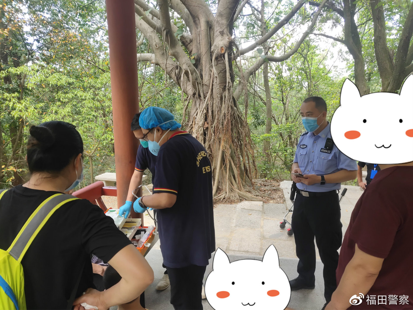 民警協(xié)助醫(yī)護(hù)人員為中暑老人檢查