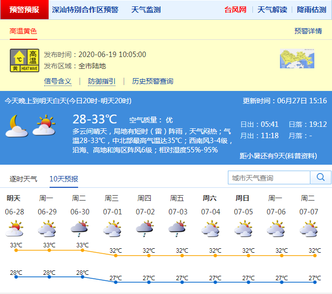 見圳客戶端?深圳新聞網2020年6月27日訊 根據深圳氣象局最新消息,深圳市27日17-20時,多云間晴天,局地有零星小雨;氣溫29-32℃;西南風3-4級,沿海和高地最大陣風6級;相對濕度65%-85%。