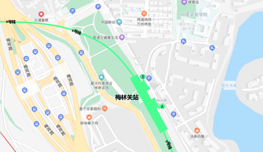 梅林關(guān)站位于梅觀路與豐澤湖小區(qū)之間綠化帶內(nèi),整體與梅觀路平行,呈南北走向。車站南端頭至星河丹堤小區(qū)內(nèi),北端頭至梅林關(guān)檢查站出關(guān)口處,西側(cè)緊靠梅觀路。車站共設(shè)出入口2個:A、B。