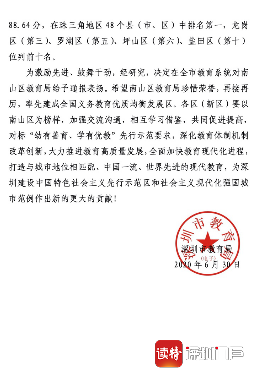 見圳客戶端·深圳新聞網(wǎng)2020年7月1日訊(深圳特區(qū)報(bào)記者 李麗)6月30日,《深圳市教育局關(guān)于表揚(yáng)南山區(qū)教育局的通報(bào)》在全市教育界引起關(guān)注。通報(bào)表示,近日,廣東省人民政府教育督導(dǎo)室印發(fā)深圳市2018年度履行教育職責(zé)評(píng)價(jià)意見,深圳2018年度履行教育職責(zé)評(píng)價(jià)成績(jī)?yōu)?8.20分,在珠三角地區(qū)9個(gè)地級(jí)市中排名第一,其中,南山區(qū)成績(jī)?yōu)?8.64分,在珠三角地區(qū)48個(gè)縣(市、區(qū))中排名第一。經(jīng)研究,決定在全市教育系統(tǒng)對(duì)南山區(qū)教育局給予通報(bào)表揚(yáng),并希望南山區(qū)教育局率先建成全國(guó)義務(wù)教育優(yōu)質(zhì)均衡發(fā)展區(qū)。