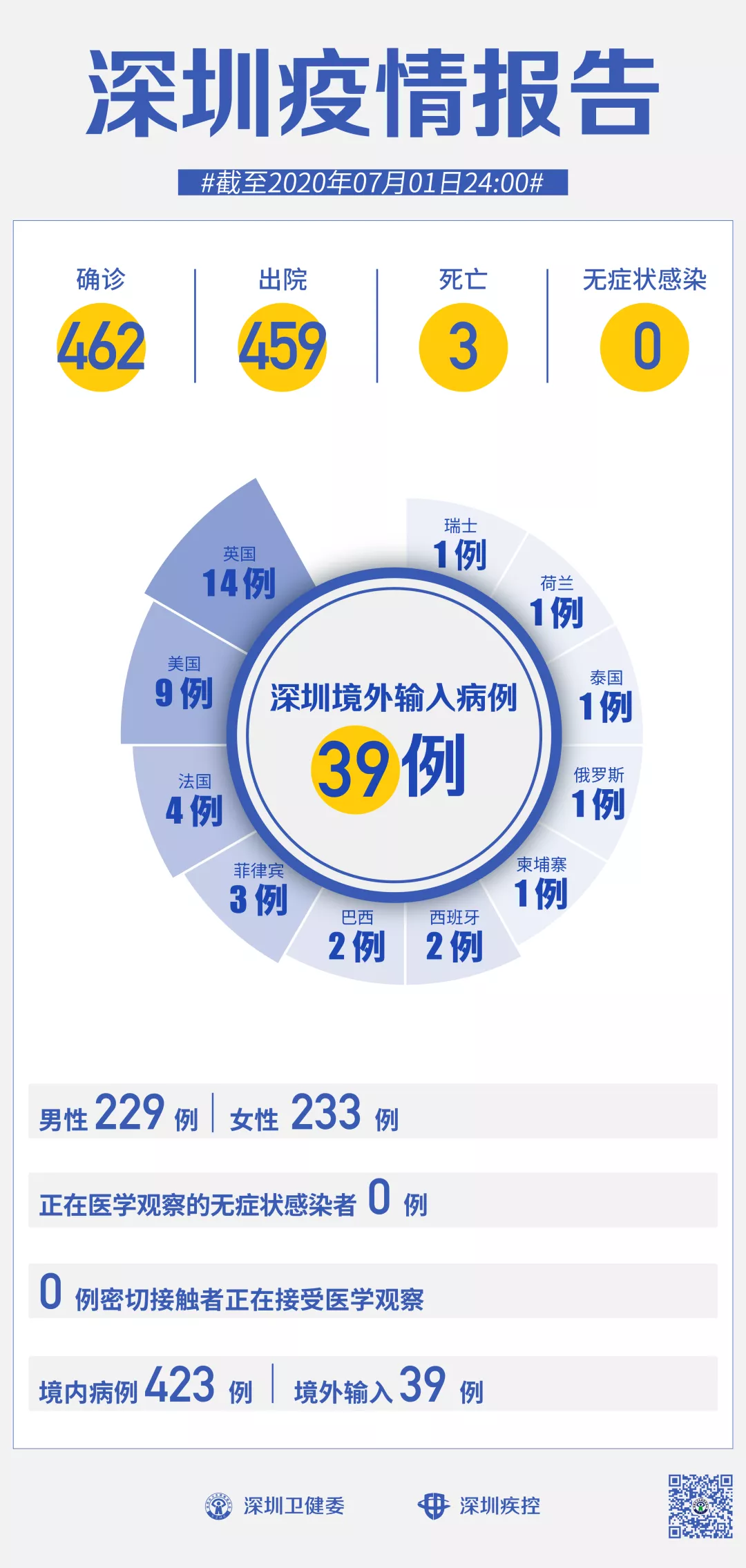 截至7月1日24時,深圳累計報告新冠肺炎病例462例。