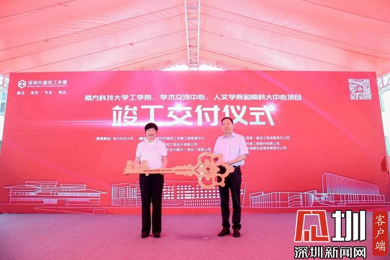 深圳市建筑工務(wù)署署長喬恒利向南方科技大學(xué)黨委書記郭雨蓉移交鑰匙牌。