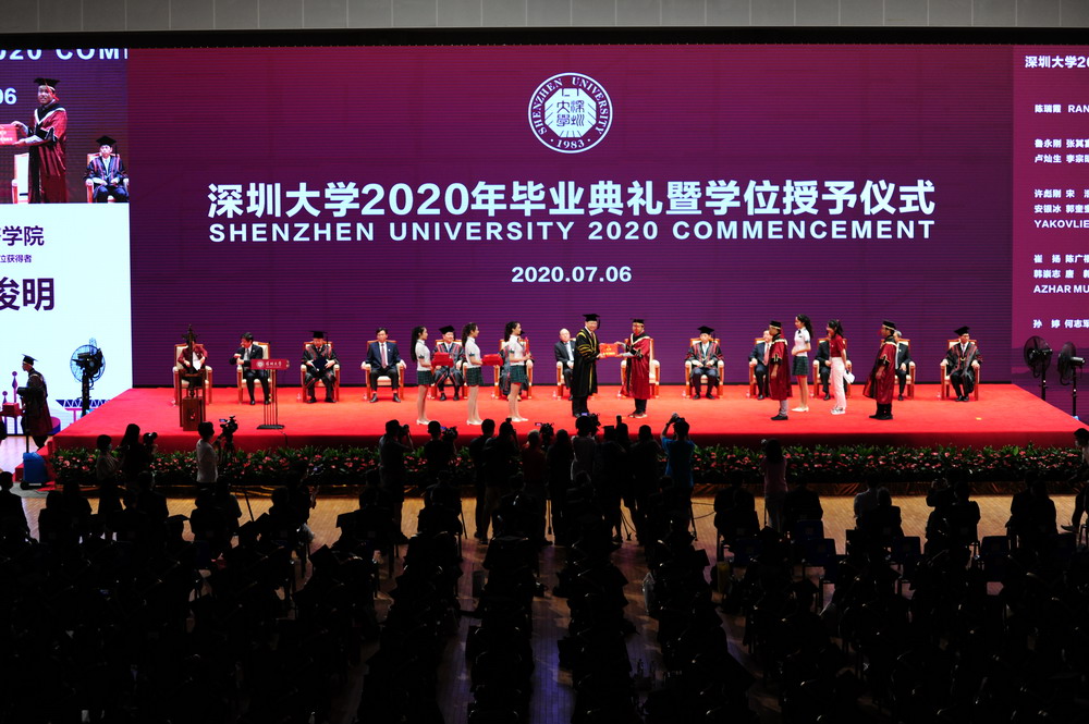 上午9時(shí),畢業(yè)典禮在莊嚴(yán)的國歌聲中拉開了帷幕。據(jù)介紹,2020年深圳大學(xué)畢業(yè)研究生數(shù)量創(chuàng)歷史新高,達(dá)到2334名,包括44位博士學(xué)位獲得者,2290位碩士學(xué)位獲得者。其中,郭奎奎等20人獲得廣東省優(yōu)秀學(xué)生稱號,李豪道等140人榮獲國家獎(jiǎng)學(xué)金,曾吉申等64人榮獲鵬城獎(jiǎng)學(xué)金、騰訊創(chuàng)新獎(jiǎng)學(xué)金。