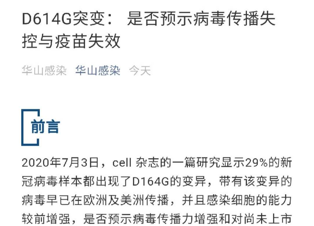 張文宏稱,特別是在7月3日,國際著名雜志《細(xì)胞》發(fā)表文章顯示,29%的新冠病毒樣本出現(xiàn)了D164G的變異,此次北京疫情反彈中發(fā)現(xiàn)的病毒株也有這個(gè)突變。