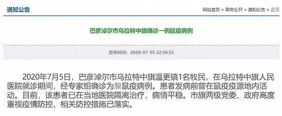 7月5日傍晚,內(nèi)蒙古巴彥淖爾市衛(wèi)生健康委員會(huì)發(fā)布通告稱,烏拉特中旗人民醫(yī)院報(bào)告了1例疑似腺鼠疫病例,經(jīng)研究決定,于7月5日發(fā)布鼠疫防控Ⅲ級(jí)預(yù)警。當(dāng)天晚間,巴彥淖爾市衛(wèi)生健康委員會(huì)再次發(fā)布通告稱,該市烏拉特中旗確診一例鼠疫病例。