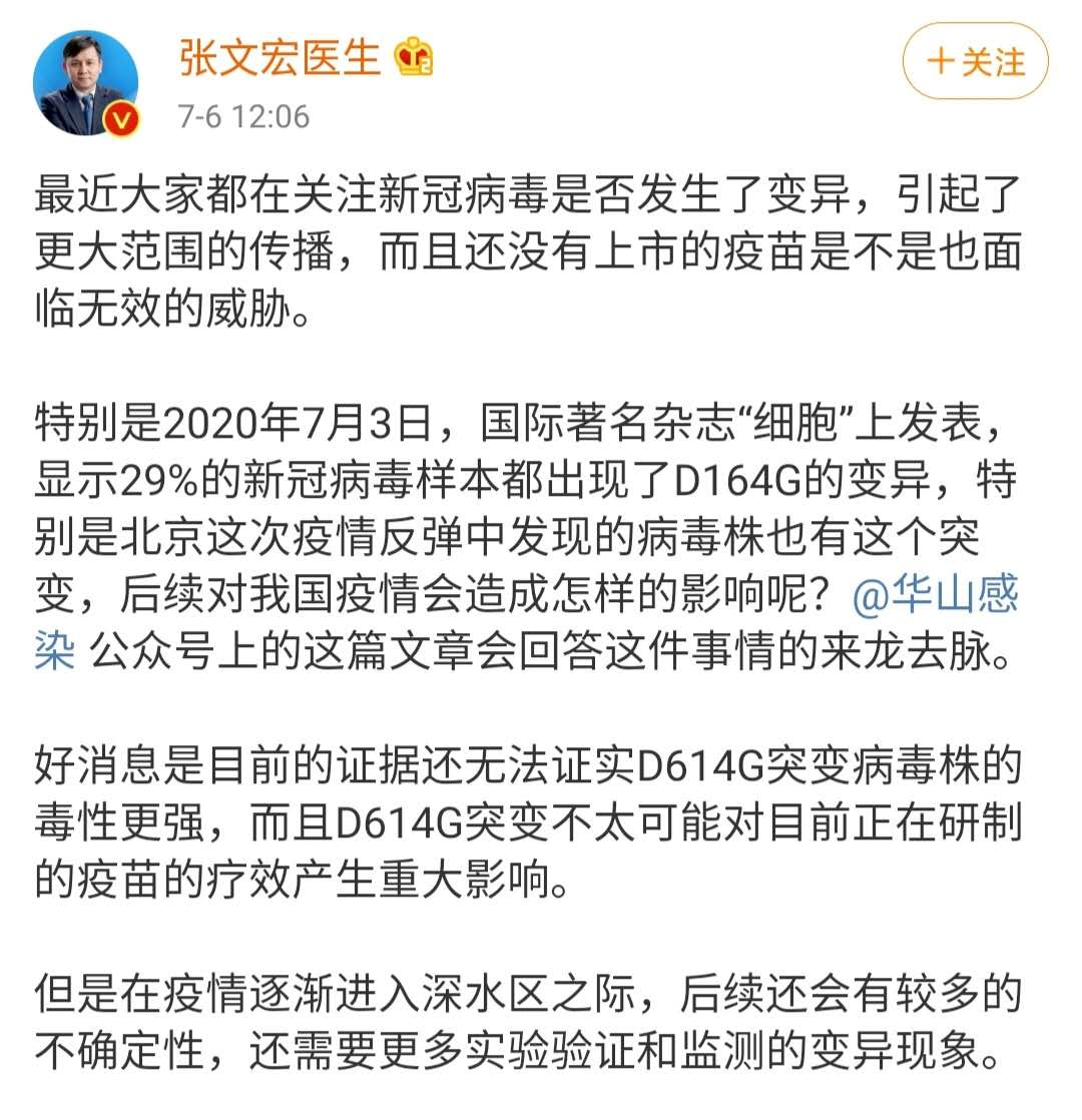 7月6日,上海復(fù)旦大學(xué)附屬華山醫(yī)院感染科主任張文宏通過微博談“29%新冠病毒樣本現(xiàn)D614G變異”一事。