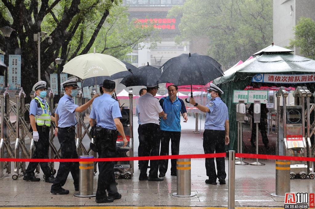 上午11時,深圳部分地區(qū)下起陣雨,交警在考點外了解現(xiàn)場情況。